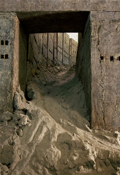 Effets du temps, vestiges archéologiques ou détruits par la guerre ? A moins qu'il ne s'agisse de lieux abandonnés, cachettes ou lieux de détention... On est capté par des images fortes de ruelles, de cours enserrées, de tranchées, de puits, de fosses, avec coulées de sable, amoncellement d'objets poussiéreux, pierres, ferrailles et aussi ce linge oublié... depuis quand ? Puis on découvre, fasciné, la première étape : des maquettes remarquablement pensées, construites et éclairées. Créatrice de décors (musées, opéra, théâtre, télévision, cinéma - elle a œuvré pour des cinéastes comme Rohmer ou Polanski), Edith Dufaux est plasticienne et photographe. Une virtuose !